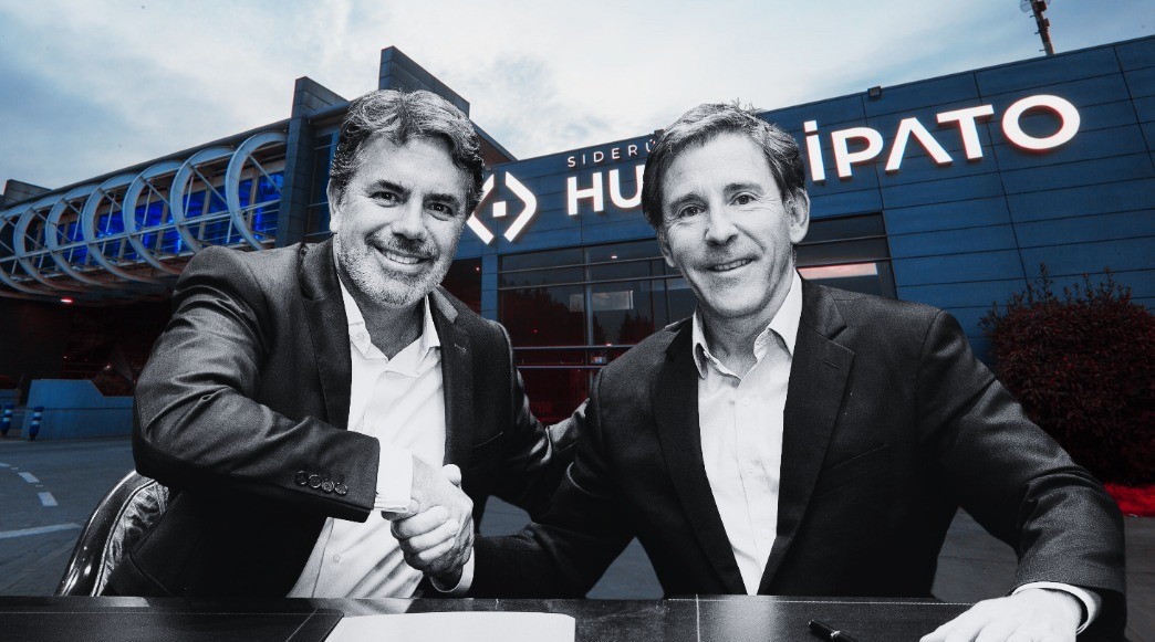 Ramón Barúa (director ejecutivo de Aclara Resources) y Nicolás Burr (gerente general de Grupo CAP); de fondo, la Siderúrgica Huachipato
