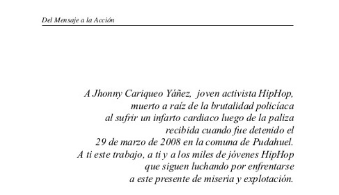 Dedicatoria libro "Del Mensaje a la Acción, Construyendo el Movimiento Hip-Hop en Chile" - Pedro Poch Plá