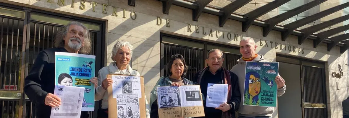 Este 7 de agosto, en el frontis del Ministerio de Relaciones Exteriores de Chile, cinco de las organizaciones que integran el Espacio Día a Día por Julia Chuñil, la Comisión Ética Contra la Tortura, el Movimiento por el Agua y los Territorios (MAT), el Observatorio Latinoamericano de Conflictos Ambientales (OLCA), el Centro Ecocéanos y la Plataforma Chile Mejor sin TLC, presentaron ante la prensa y la opinión pública el informe “De la sociedad civil al Comité de Derechos Económicos, Sociales y Culturales de Naciones Unidas, en su 78º período de sesiones”.