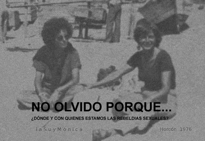 Una playa en otra playa. En el concurrido sector de Bellavista en Tomé, sobre uno de los muros, frente al mar, se encuentra la serie de tres estampas que reproducen una fotografía capturada en 1976. La imagen monocromática registra a una pareja de mujeres que sonríen sentadas sobre la arena en la playa de Horcón. Ellas son Susana Peña Castro y Mónica Briones Puccio. Bajo el retrato, escritas la frase NO OLVIDO PORQUE y la pregunta que interpela al transeúnte ¿Dónde y con quiénes estamos las rebeldías sexuales?