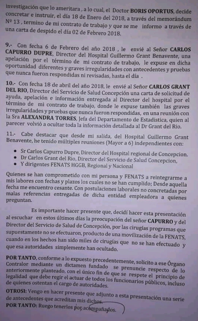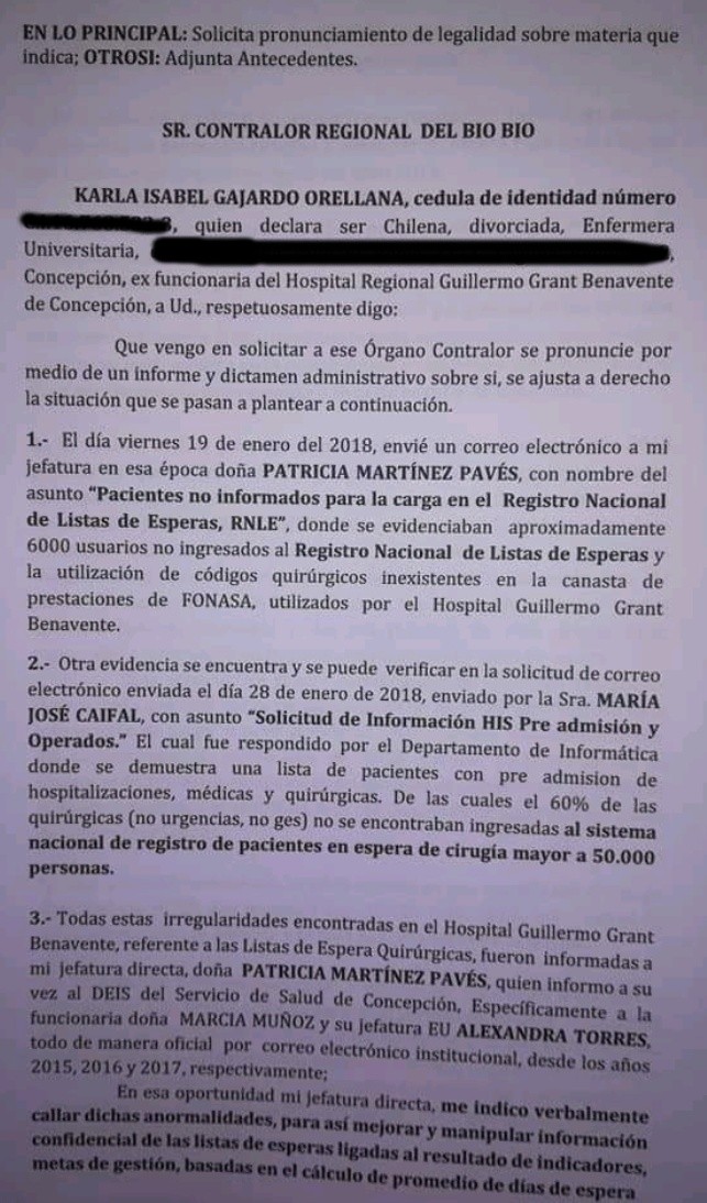 [resumen.cl] La ex funcionaria del Hospital Regional de Concepción y encargada de las listas de espera quirúrgicas del recinto entre los años 2015 y 2018, la enfermera Karla Gajardo, denunció a Contraloría que miles de pacientes del hospital nunca fueron ingresados al Repositorio Nacional de Listas de Espera para así mejorar artificialmente la gestión del establecimiento.