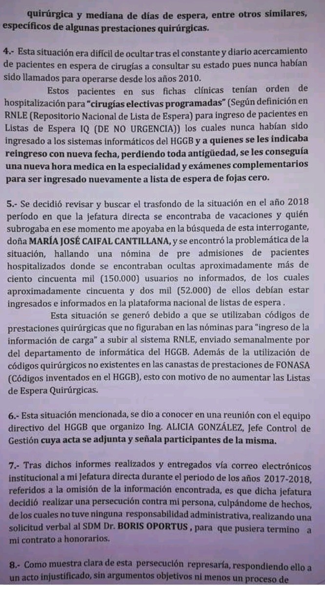 Según detalla Gajardo, el hospital maneja una lista oculta de 150 mil usuarios, de los cuales 52 mil se encontrarían en espera de cirugía, lo que fue presentado por la exfuncionaria a la entidad fiscalizadora con la evidencia donde se encuentran los registros. “Estas listas van desde el año 2010 hasta enero del 2018, por lo que yo puedo concluir que a la actualidad la cifra ya debería estar duplicada o aumentada al menos en un 60%” fustiga.