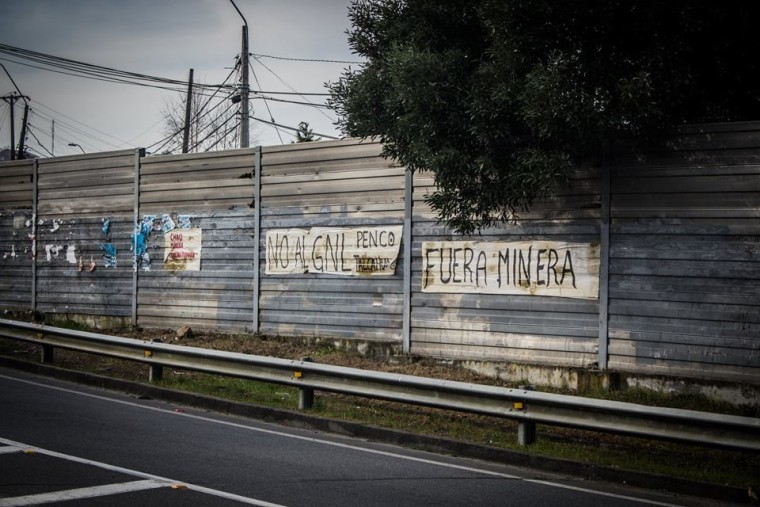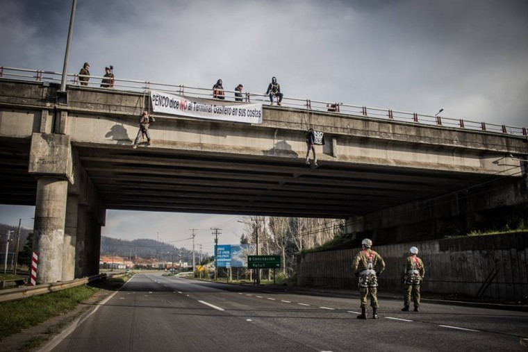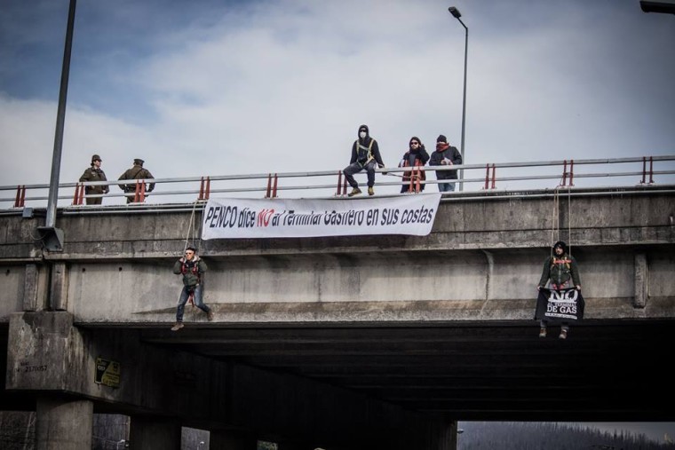 Esta misma tarde, en el paso nivel del enlace Penco de la Autopista del Itata con la Ruta 150 entre Concepción y Penco, activistas socioambientales se colgaron junto a un lienzo con la leyenda "Penco dice No al terminal Gasífero en sus costas".
