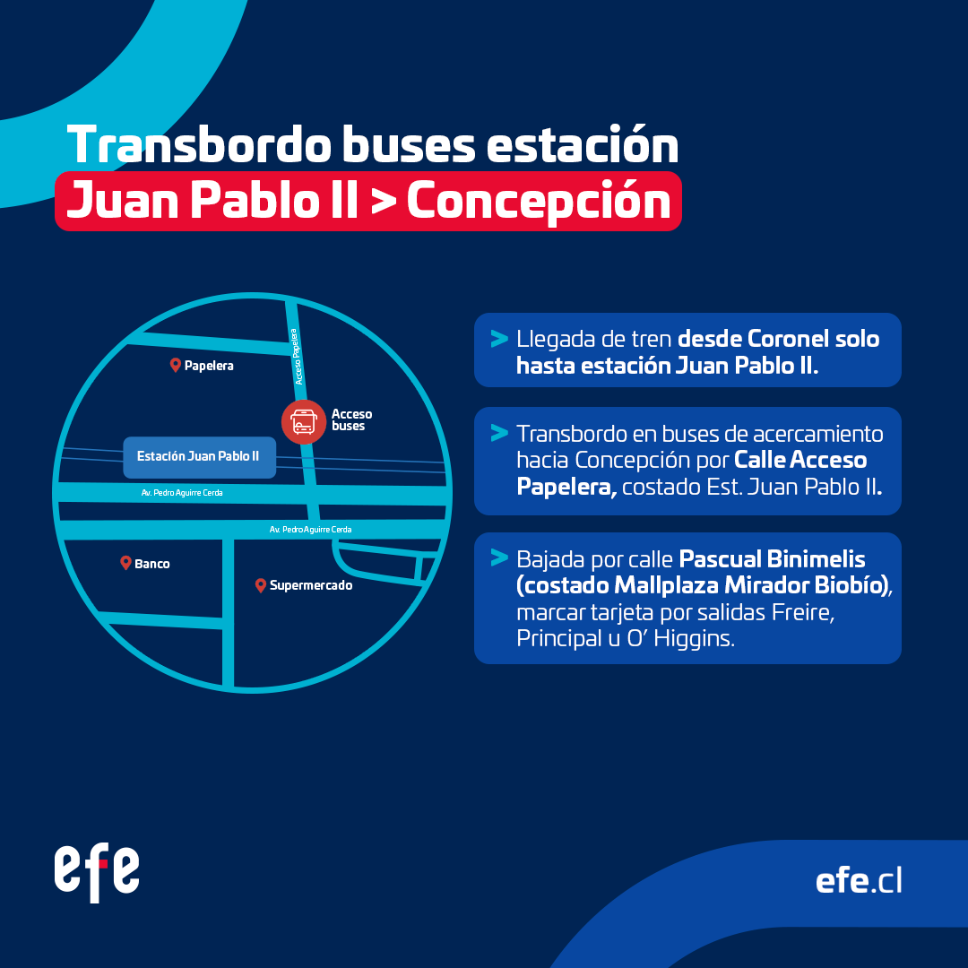 Para compensar estos inconvenientes a los miles de usuarios de este servicio de transporte público, la empresa EFE dispuso servicios de trasbordo de pasajeros a través de buses para cruzar el río Biobío, sin costo extra.