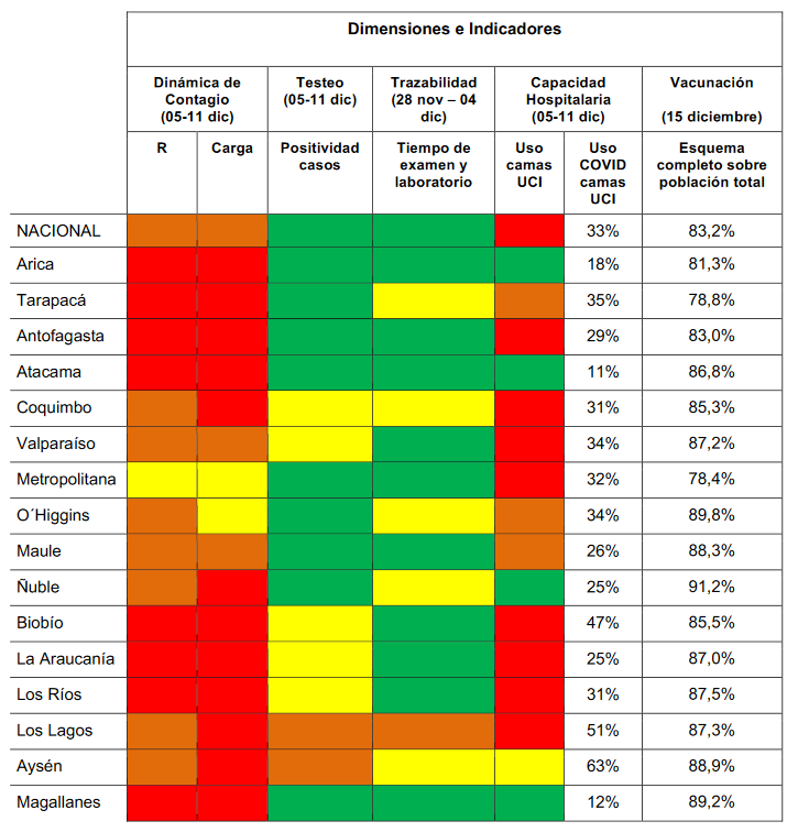 Resumen de indicadores por región. Los colores muestran el estado de la propagación del coronavirus SARS-CoV-2 en Chile. En rojo: Fuera de control. En naranjo: El umbral más peligroso. En amarillo acercándose al nivel de control más bajo. En verde: en camino a la contención. Fuente: https://www.icovidchile.cl/informes