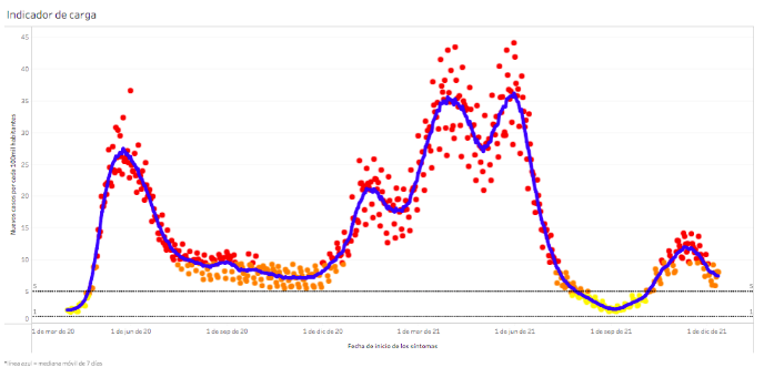 Variación del indicador de carga (Promedio de casos nuevos de contagio en los últimos siete días) en Chile entre abril de 2020 y diciembre de 2021.