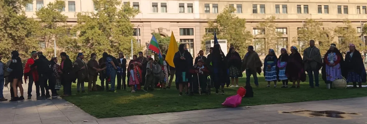 [caption id="attachment_151029" align="alignnone" width="1600"] Manifestación de familias mapuche pewenche en las afueras de La Moneda | Fotografía enviada a Resumen.cl[/caption]