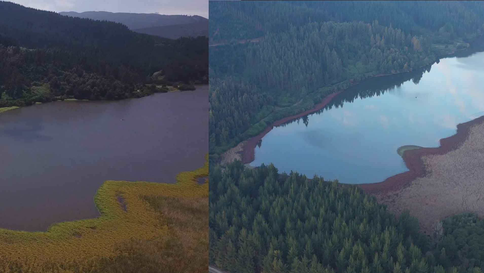 En la izquierda laguna Quiñenco en Febrero de 2021. En la derecha en Junio de 2021