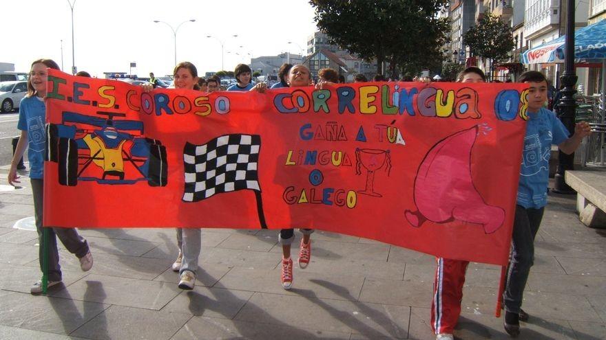 Ana Peleteiro, tercera de izquierda a derecha, en Corrilingua, manifestación en apoyo y salvaguarda del idioma galego