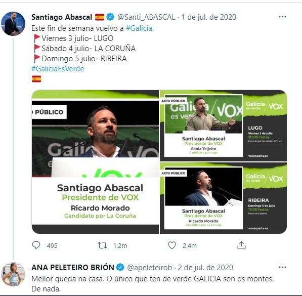 Ya hace unos años ante una visita del líder de la extrema derecha española Abascal a Galicia, Ana Peleteiro en su idioma planteó: "Mejor quédate en casa. Lo único verde que hay en Galicia son los montes. De nada".
