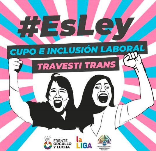 El pasado jueves 24, tras una larga discusión en el Senado argentino, se aprobó la nueva Ley de Cupo e Inclusión Laboral Travesti Trans “Diana Sacayán – Lohana Berkins”, ley que lleva el nombre de dos activistas trans de dicha nación. La medida ya había sido aprobada por la cámara de diputadas y diputados el 8 de junio con 207 votos a favor, 11 en contra y 7 abstenciones, siendo ratificada por la cámara alta con 55 votos favorables, 1 en contra y 6 abstenciones.