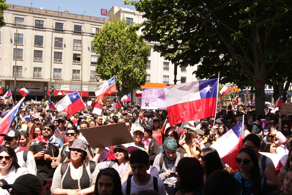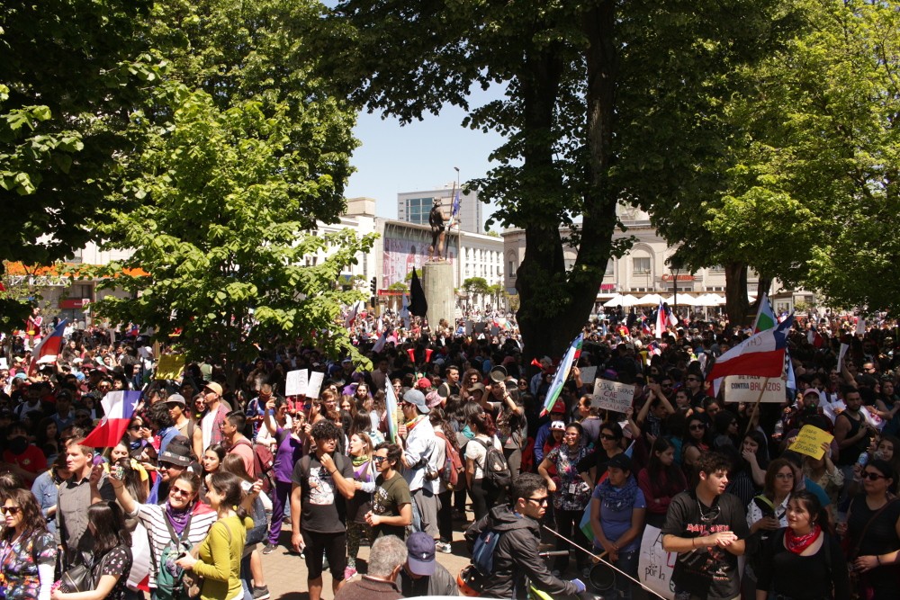 Manifestantes en torno al odeón de la Plaza Independencia de Concepción