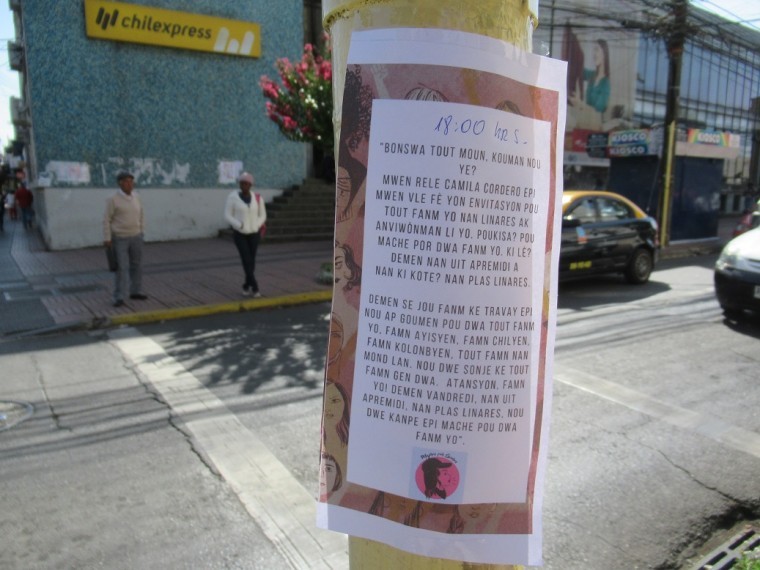 El día viernes por la mañana salí a recorrer las calles céntricas de Linares, constatando la presencia de numerosos rayados sobre los muros con consignas que resaltaban las demandas del Movimiento Feminista. Asimismo, durante este recorrido, pude observar la presencia de numerosos panfletos escritos en idioma creole, instalados sobre postes de luz, señaléticas del tránsito y arboles, llamando a las mujeres haitianas y de otras nacionalidades, a participar en la marcha, migrantes que han llegado en gran número a esta zona para trabajar en labores agrícolas como temporeras, principalmente en la recolección de fruta o en los packing.