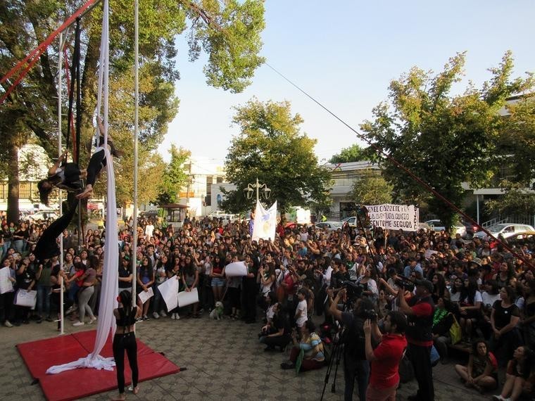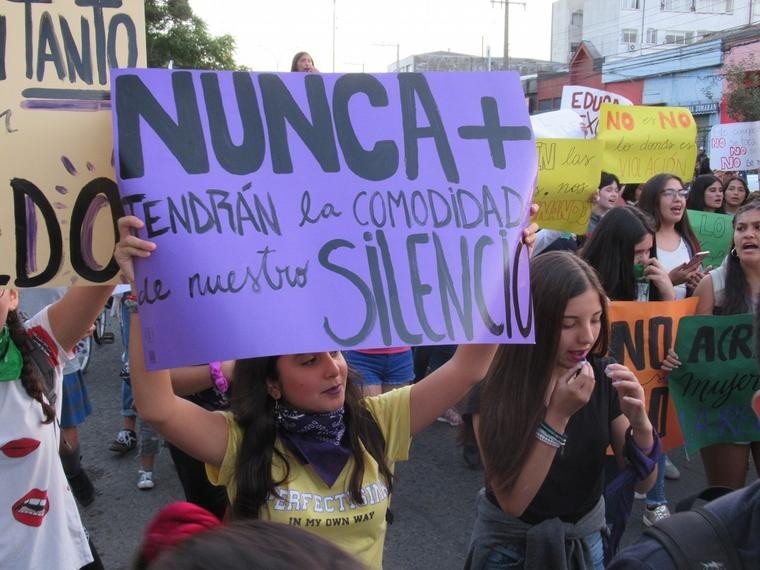 La marcha continuó su recorrido dando vueltas a la plaza y al llegar frente a la Catedral se produjo una acción espontánea en donde numerosas mujeres se colocaron sobre las escalinatas de la iglesia, denunciando el encubrimiento de las instituciones eclesiásticas con los abusos sexuales cometidos por sacerdotes. Por alrededor de diez minutos las manifestantes estuvieron protestando en dicho lugar, después de lo cual se dirigieron nuevamente hacia el sector en donde se desarrollaba el “acto recreativo” del IND, el cual debió terminar en forma abrupta y anticipada ante la enérgica y decidida protesta de las mujeres movilizadas, que además interpelaron a las mujeres que participaban de esa actividad gritándoles “mujer escucha, únete la lucha”. Solo fueron algunas pocas las que se sumaron a este llamado, pero dicha acción se constituyó en una importante muestra de sororidad frente a sus pares. Un intento represivo por parte de las fuerzas policiales fue vivamente repudiado por las manifestantes, las que, saltando y cantando con energía, mientras voceaban “el que no salta es paco”, y luego “el que no salta es Pinochet”, hicieron desistir a los Carabineros de dicha actitud.