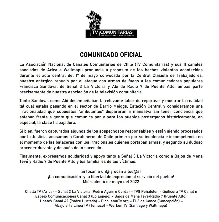La Asociación Nacional de Canales Comunitarios de Chile (TV Comunitarias) y sus 11 canales asociados de Arica a Wallmapu se pronuncia a propósito de los hechos violentos acontecidos durante el acto central del 1 de mayo convocada por la Central Clasista de Trabajadores, nuestro enérgico repudio por el ataque con armas de fuego a las comunicadoras populares Francisca Sandoval de Señal 3 de La Victoria y Abi de Radio 7 de Puente Alto, ambas parte precisamente de nuestra asociación de la televisión comunitaria.