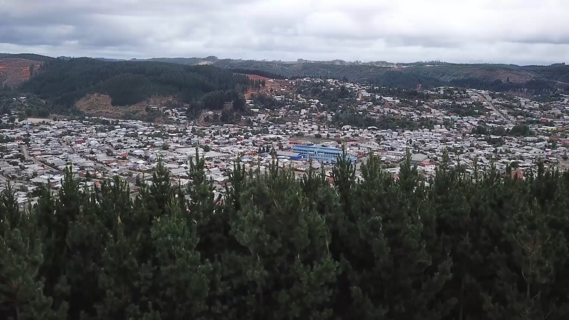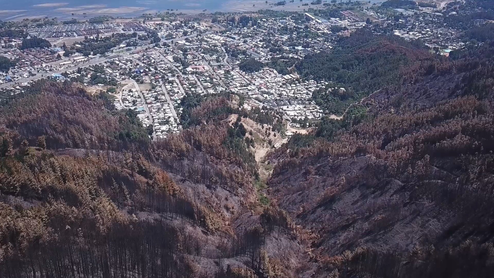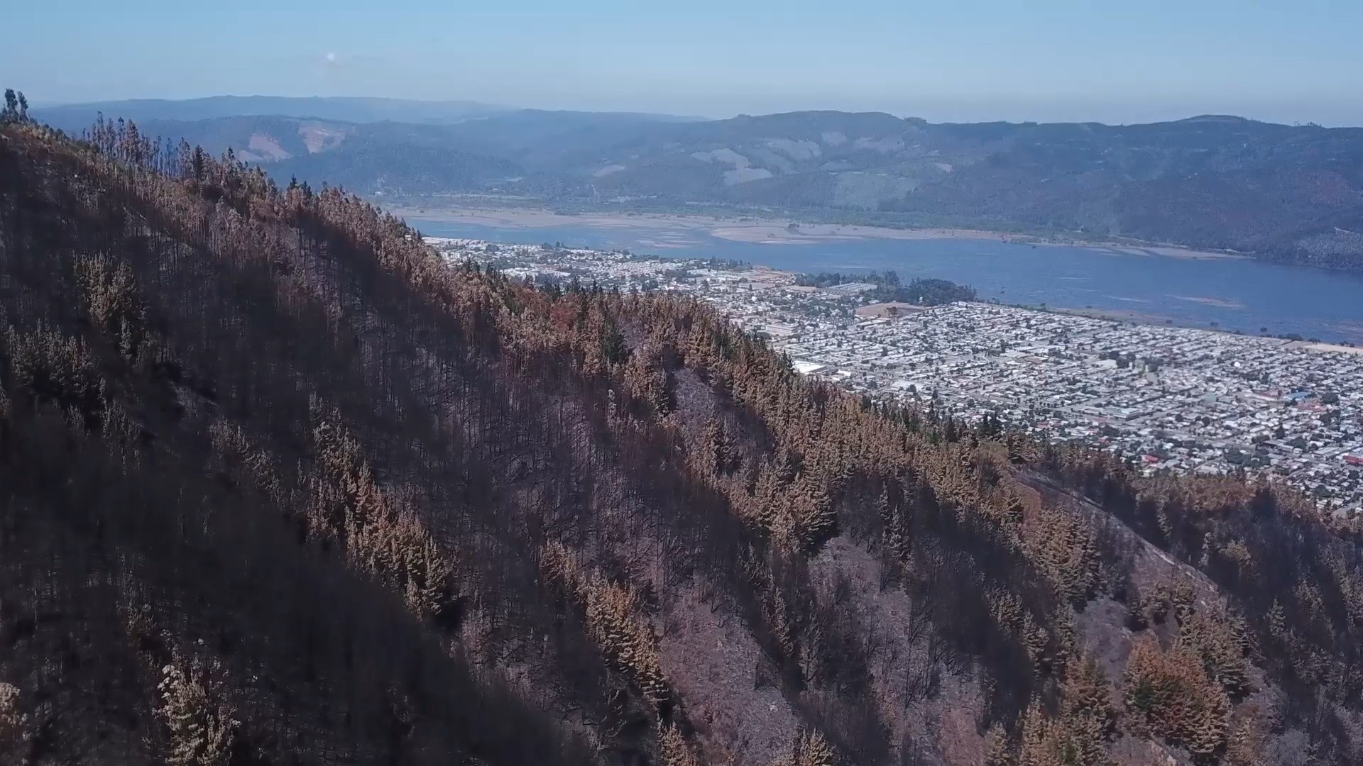Curanilahue, rodeado de monocultivos de pino y eucalipto, sin cortafuegos.