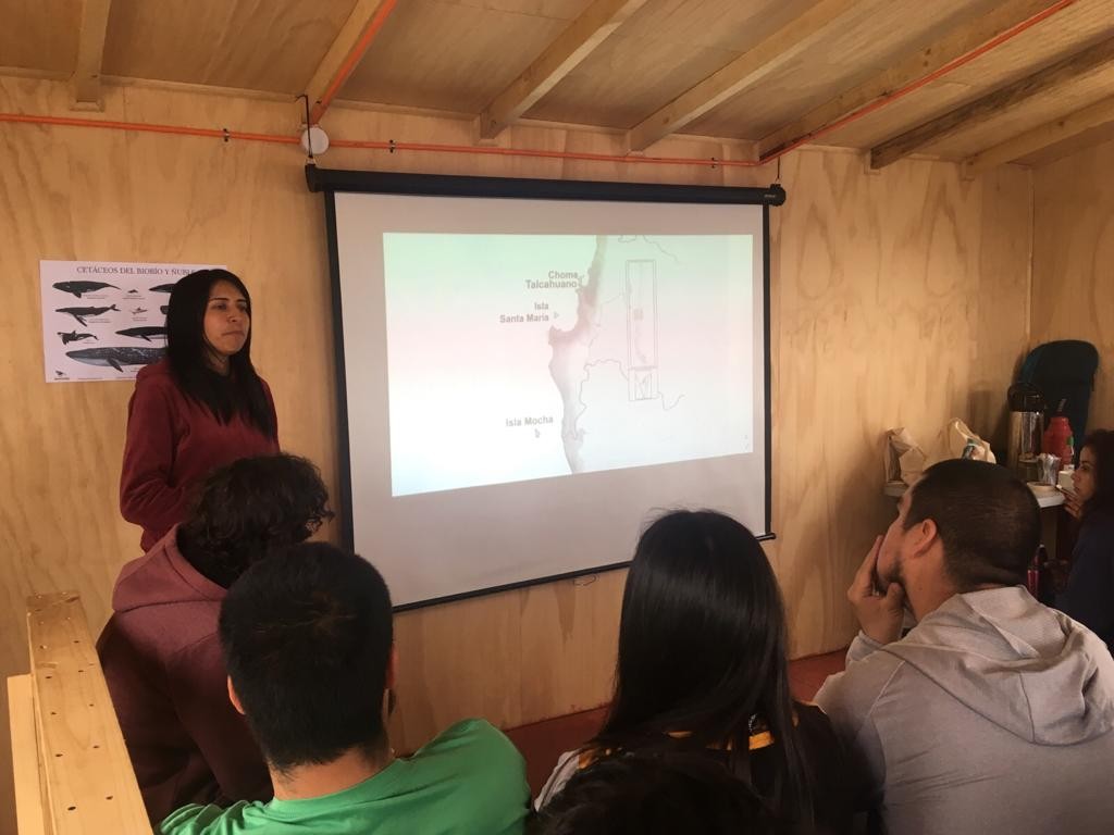 Calderón detalló que en estas costas existen “la Ballena Sei, la Ballena de Bryde, la Ballena Azul, la Ballena Franca Austral, Ballena Jorobada y la Ballena Fin, que es súper emblemática porque es el ultimo animal cazado aquí en el año 83 y es el esqueleto que encontramos afuera de la Facultad de Ciencias Naturales y Oceanográficas en la U. de Concepción”.