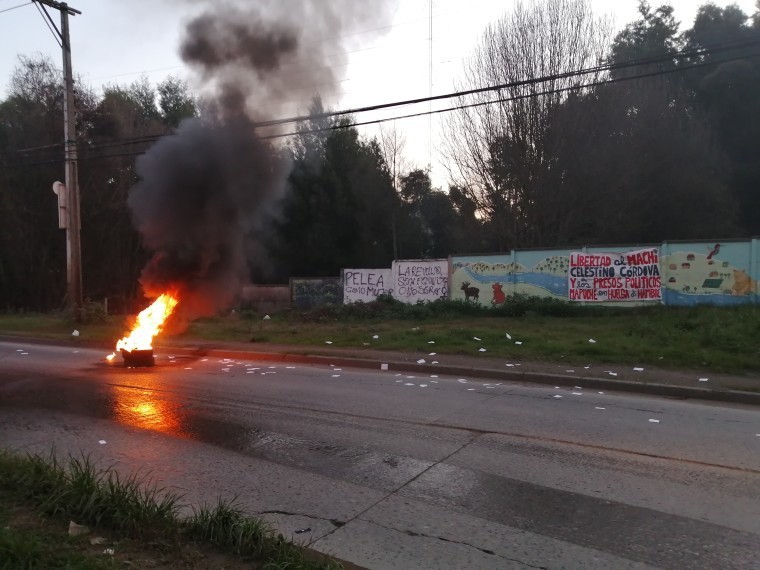 [resumen.cl] Al atardecer de este jueves, múltiples barricadas se registraron en distintos puntos de la intercomuna. En panfletos y lienzos denunciaron la critica situación de salud en que se encuentra el machi Celestino Córdova y los presos políticos mapuche en Angol, Temuco y Lebu.