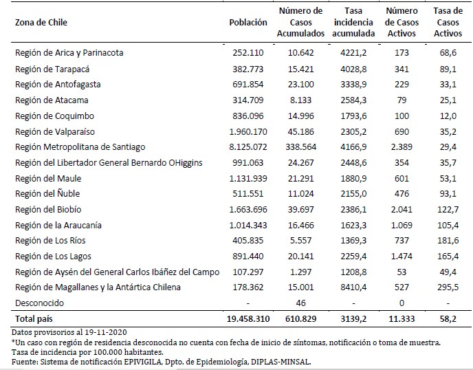 La siguiente tabla muestra el número de casos y tasa de incidencia de casos COVID-19 según región de residencia en Chile, con fecha al 19 de noviembre de 2020.