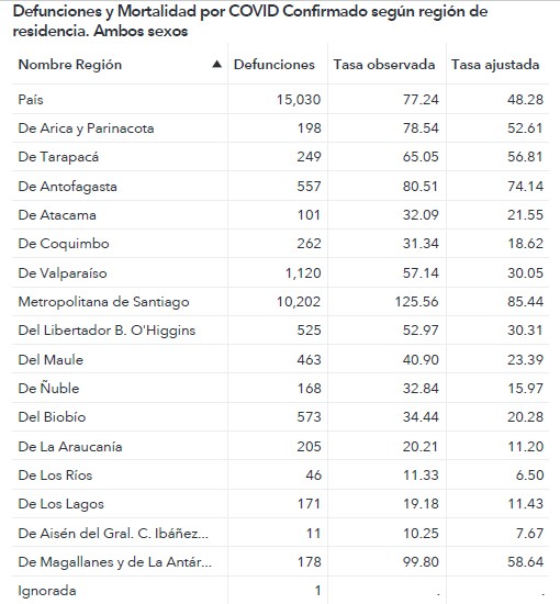 La cantidad muertes considerando casos confirmados alcanzó las 15.030 personas. La región del Biobío registró 573 muertes confirmadas de COVID-19