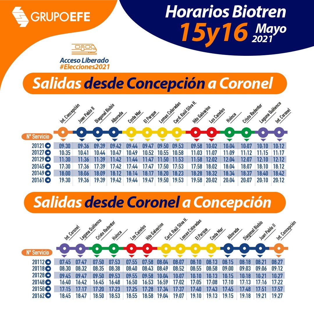 [resumen.cl] Al igual que ayer, el Biotrén y otros servicios de zonas aisladas funcionarán sin costo este domingo de elecciones para facilitar el traslado de votantes en la región del Biobío. ¿Quieres saber sus horarios y facilidades? revisa la nota a continuación.