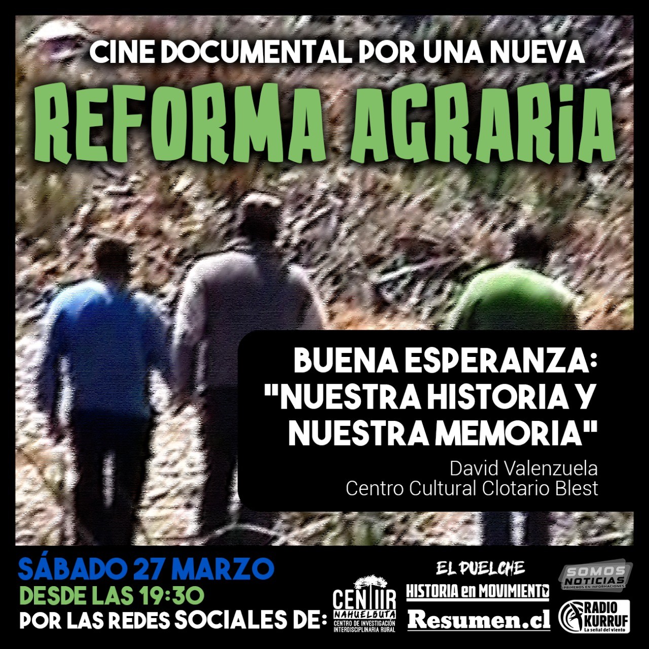 Este sábado 27 de marzo desde las 19:30 hrs continúa el Cine Documental por una Nueva Reforma Agraria con la proyección del documental inédito en la red: "Buena Esperanza. Nuestra Historia y Nuestra Memoria.", sobre la historia y el desplazamiento forzado sufrido en los '80 por las y los habitantes del fundo Buena Esperanza.Por CENTIIR