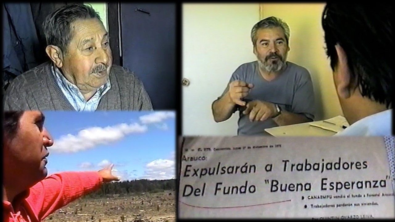 Imágenes del documental. Arriba a la izquierda: Aquiles Medina Ferreira, ex habitante de Buena Esperanza Q.E.P.D; arriba a la derecha: Luis Ferreira Garrido, ex habitante de Buena Esperanza; abajo a la izquierda: Victor Contreras Silva en las tierras de Buena Esperanza bajo explotación forestal; abajo a la derecha: recorte de prensa que anuncia el desalojo, fines de los ‘70.