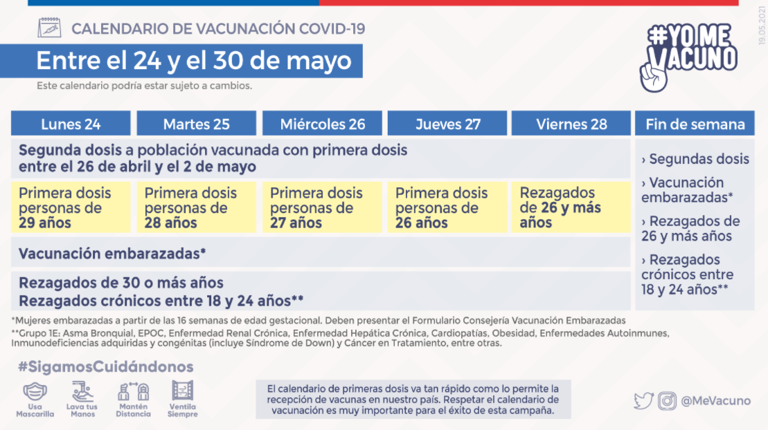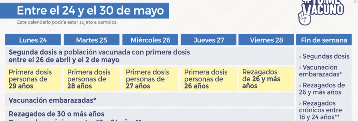 Hoy lunes el turno de vacunación es para personas de 29 años. El martes 25 corresponderá a personas de 28, y el miércoles a quienes tienen 27. Finalmente, el jueves será el turno de quienes tienen 26 y el viernes podrán vacunarse las personas los rezagadas, es decir, quienes no pudieron hacerlo el día que les correspondía.