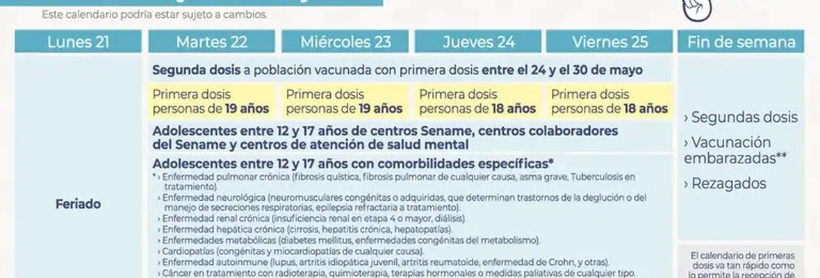 Las personas de 19 años podrán hacerlo el día martes y miércoles, mientras las de 18 les corresponderá jueves y viernes. Asimismo, esta semana también se inocularán a los y las adolescentes de 12 a 17 años de los centros del Sename o con comorbilidades específicas.