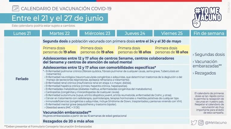 [resumen.cl] La vacunación no se realizará hoy lunes 21 de junio a causa del feriado de los pueblos originarios. Desde mañana martes 22 comienza la inoculación esta semana para jóvenes de 19 y 18 años. Revisa los detalles a continuación: