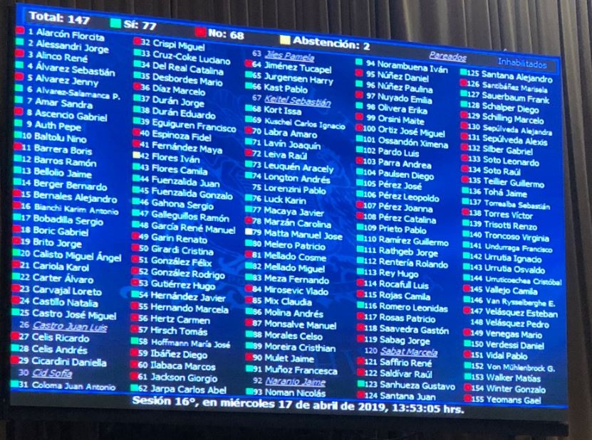 Votación en la Cámara de Diputados. Verde Aprobación, Rojo rechazo | Obtenido de Radio Universidad de Chile
