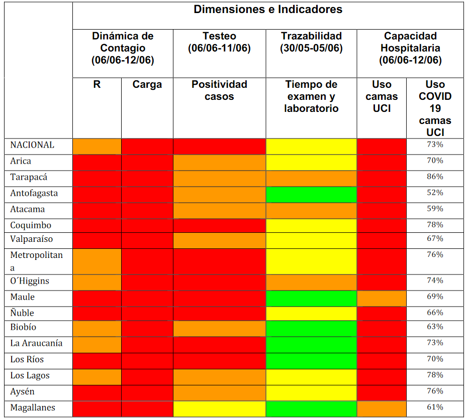 Resumen de indicadores por región. Los colores muestran el estado de la propagación del coronavirus SARS-CoV-2 en Chile. En rojo: Fuera de control. En naranjo: El umbral más peligroso. En amarillo acercándose al nivel de control más bajo. En verde: en camino a la contención. Fuente: https://www.icovidchile.cl/informes