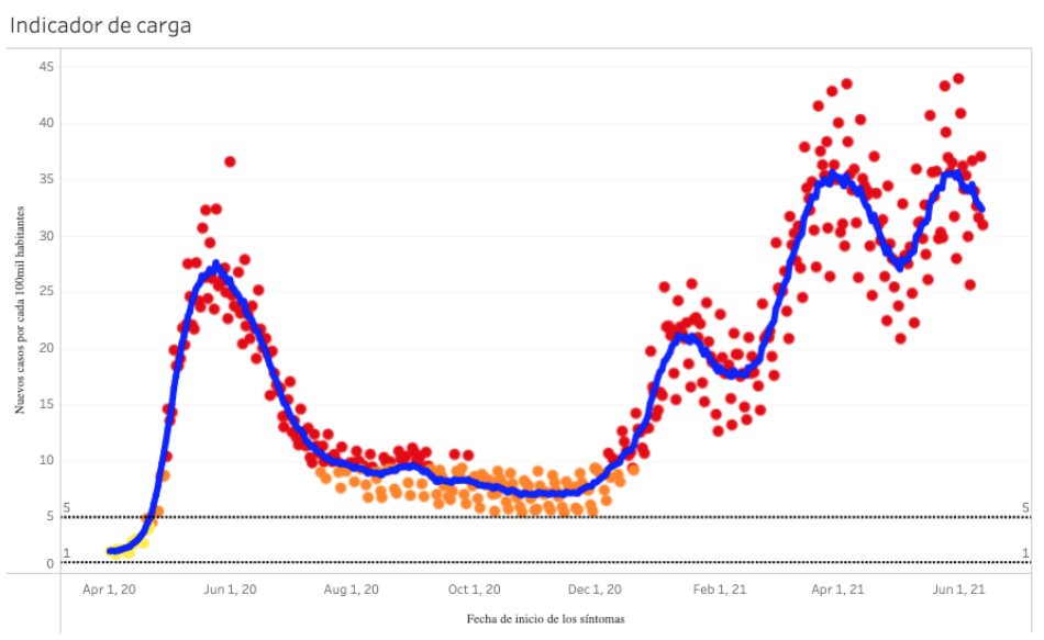 Indicador de carga en Chile (Promedio de casos nuevos de contagio en los últimos 7 días) entre abril 2020 y junio 2021.
