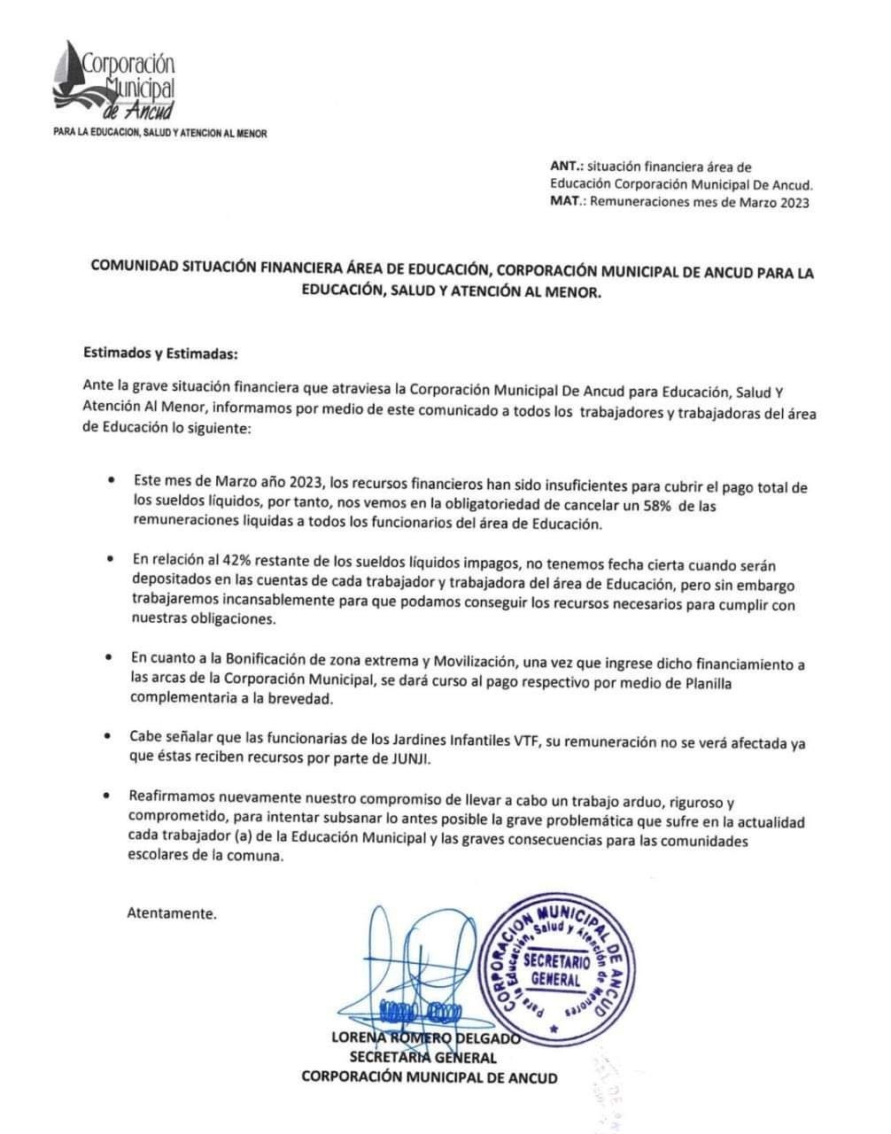 La delicada situación financiera en la que quedaron alrededor de 500 docentes, fue comunicada por la secretaria general de la Corporación Municipal de Ancud, Lorena Romero, quien informó al profesorado que, «los recursos financieros han sido insuficientes para cubrir el pago total de los sueldos líquidos».