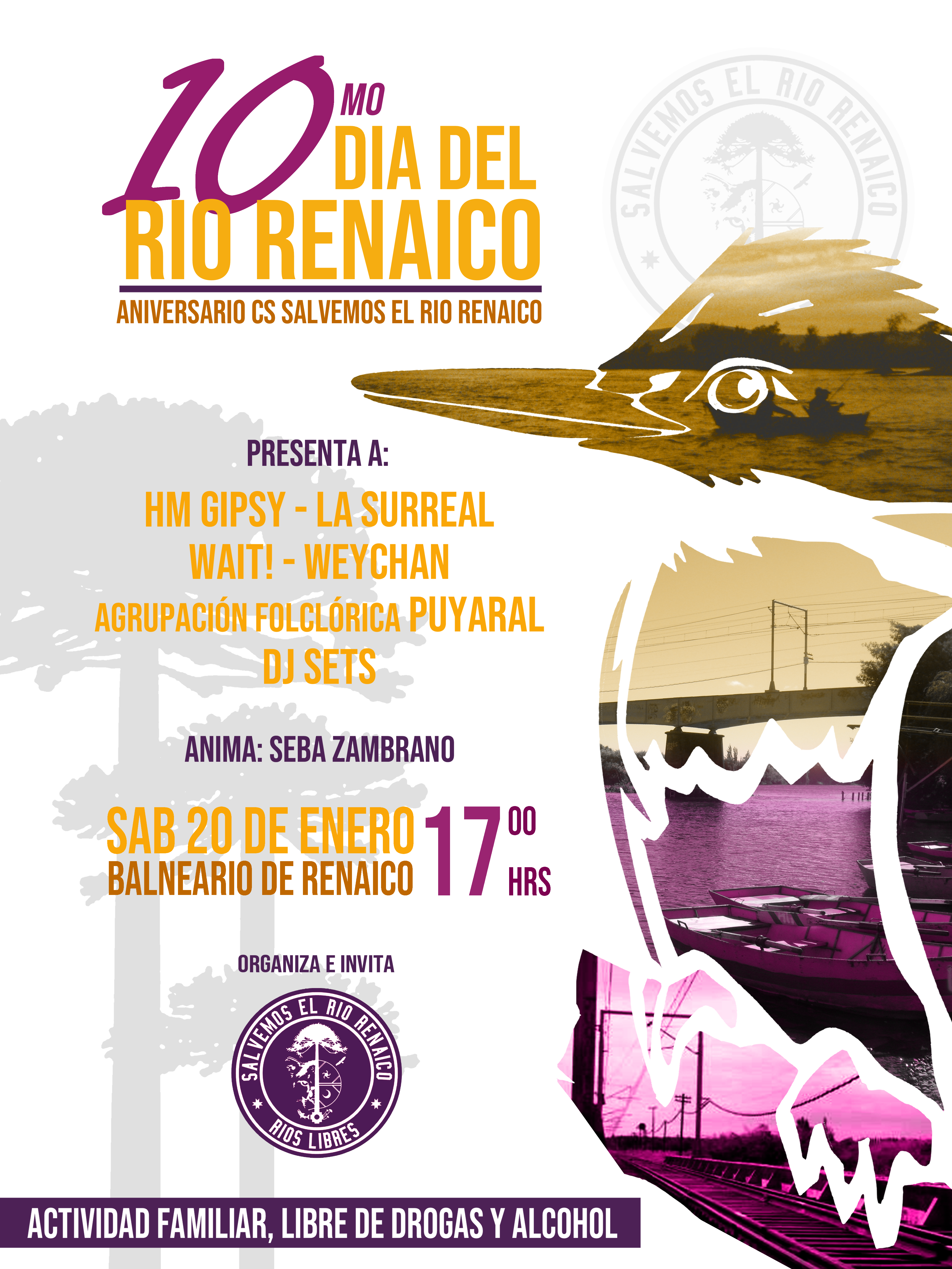 El próximo sábado 20 de enero, a partir de las 17:30 horas, en el balneario de la comuna de Renaico, ubicado en la puerta norte de la región de La Araucanía, se llevará a cabo la celebración del “Día del río Renaico”. Además, se conmemorará el décimo aniversario de la organización "Salvemos el río Renaico".