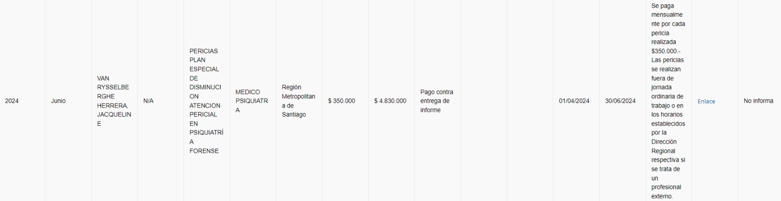 Esta situación se relaciona con lo que anteriormente hizo público este medio respecto al contrato de Jacqueline van Rysselberghe, el cual duraría tres meses: abril, mayo y junio de 2024, donde cuyo trabajo tendría una remuneración de $350.000 por cada informe de pericia psiquiátrica realizada, honorario que se pagaría tras «elaborar y presentar un informe de desempeño que contendrá la agenda de las pericias con su respectiva asistencia, el registro de los informes periciales realizados y entregados para despacho al solicitante» (revisa el contrato acá).