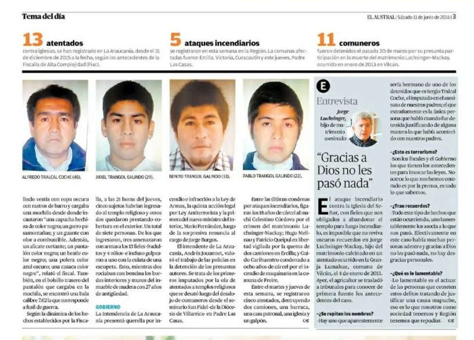 Cabe recordar que la principal prueba utilizada por la Fiscalía, para inculpar y condenar a Pablo y Benito Trangol, es el testimonio de un testigo protegido, que habría reconocido a los comuneros mapuche mediante la divulgación de sus rostros en televisión y en el diario Austral de Temuco.