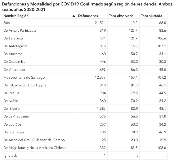 La cantidad muertes considerando casos confirmados alcanzó las 16.843 en 2020 más 4.731 personas este 2021 sumando 21.574. La región del Biobío registró 824 muertes en 2020 y 558 muertes en 2021 alcanzando un total de 1.382