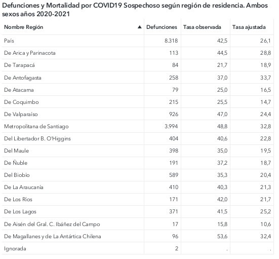 Mientras que la cifra de fallecimientos sospechosos de Covid-19 fueron 5.396 en 2020 más 2.922 personas este 2021 alcanzando 8.318 El Biobío presentó 226 muertes en 2020 y 363 muertes sospechosas en 2021 para alcanzar 589 personas.
