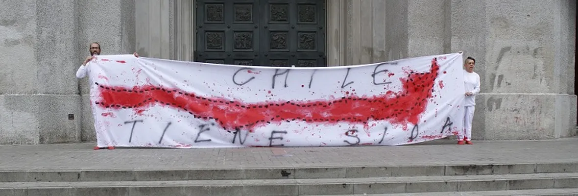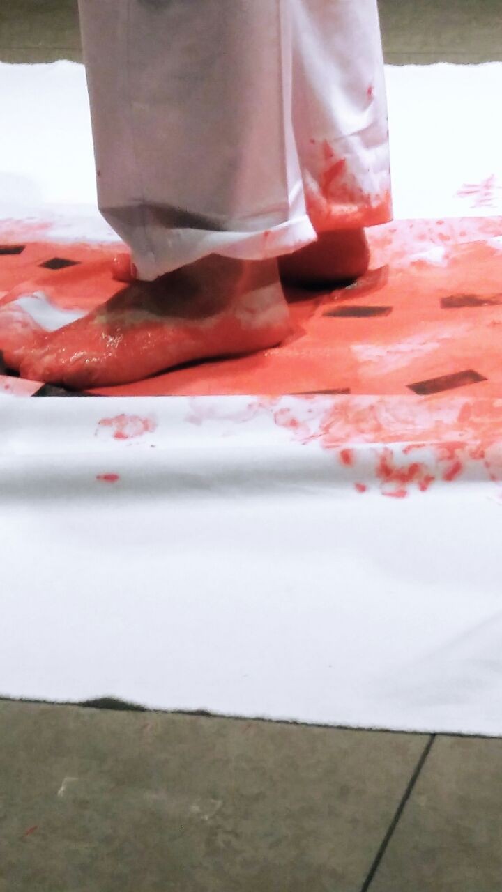 Posteriormente, tiñen sus pies de rojo, recorriendo el mapa y dejando el rastro de la epidemia, el cual rematan con un chorro de la sangre de Guillermo, "en un comienzo pensamos solo en sangre mía, pero no logramos sacar medio litro por problemas técnicos"; y luego escriben su consigna que llevan como protesta al frontis de la catedral y después a la pileta de Plaza de Armas donde lavaron el lienzo infectado, tiñendo sus aguas de rojo.