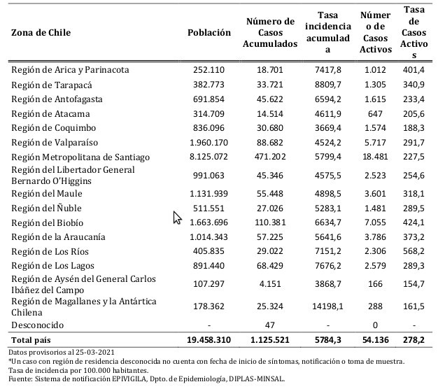 Tabla: Número de casos y tasa de incidencia de casos Covid-19 según región de residencia en Chile, con fecha al 25 de marzo de 2020.
