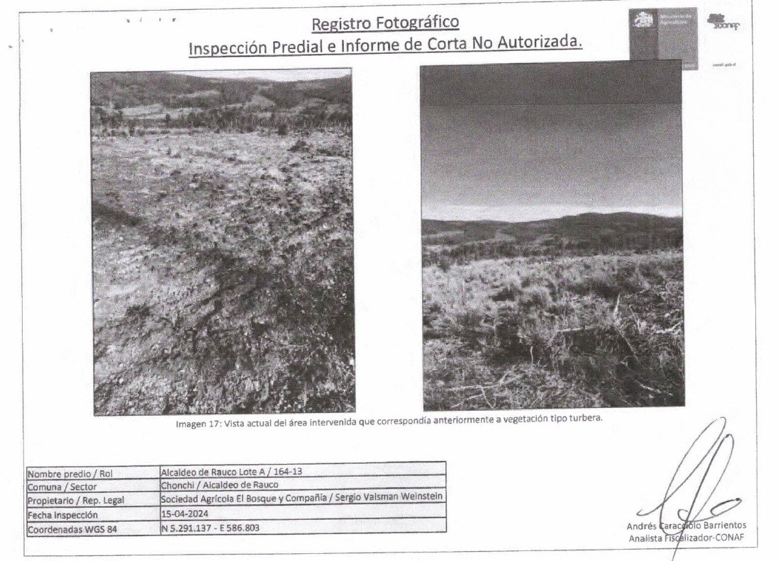 Contrariamente a lo indicado por Vaisman, y debido a que se constata no solo la tala ilegal de bosque sino también la afectación de turberas y cursos de agua, “CONAF (aparte de la multa por tala ilegal) derivará los antecedentes al SAG por las competencias de dicho organismo en la materia, así como a la Superintendencia de Medio Ambiente por las posibles implicancias del proyecto energético que se proyecta en la zona” (IT CONAF Código FF-FF-7.5-P1-R16).