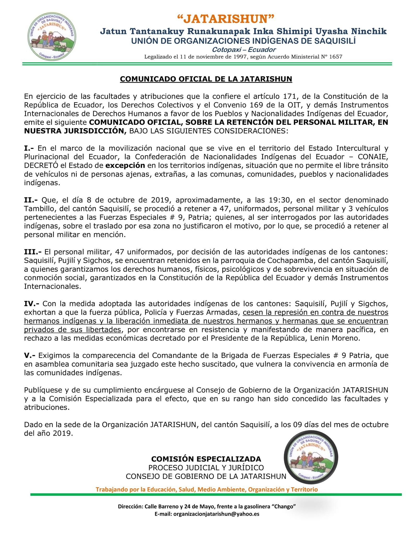 Por su parte, mediante un comunicado la Unión de Organizaciones Indígenas del Cantón Saquisilí JATARISHUN, señala que han iniciado una política de autodefensa en los territorios de sus comunidades ante la agresión de agentes del Estado, efectuando la retención de 47 efectivos militares para, en sus palabras, garantizar los derechos humanos, físicos, psicológicos y de sobrevivencia en situación de conmoción social.