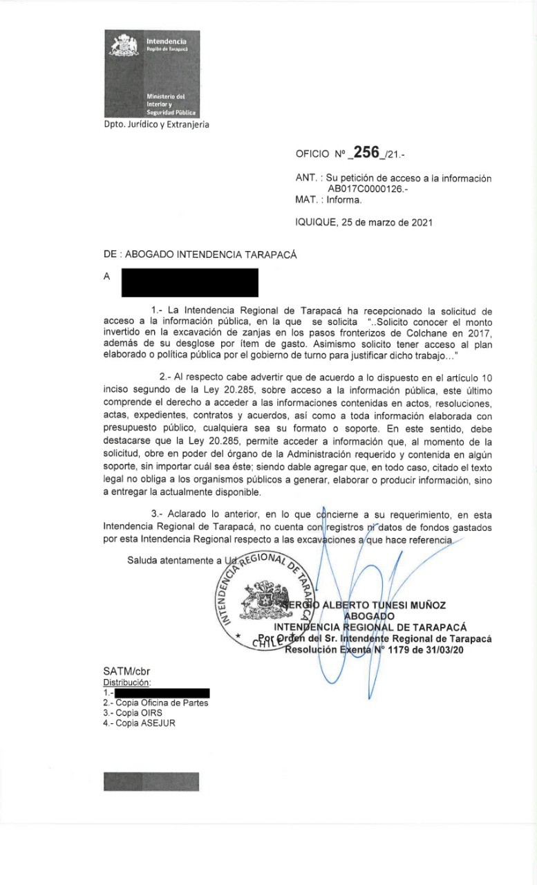 Mediante una solicitud de transparencia, RESUMENconsultó a la Intendencia en cuestión, protagonista en el hecho, "el monto invertido en la excavación de zanjas en los pasos fronterizos de Colchane en 2017, además de su desglose por ítem de gasto", como también acceder "al plan elaborado o la política pública por el gobierno de turno para justificar dicho trabajo".