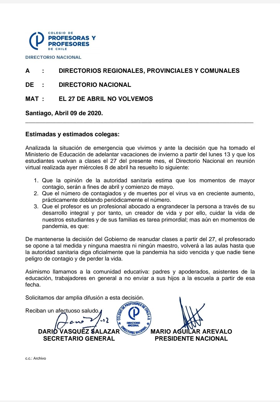 El rechazo al irresponsable anuncio de las autoridades de Educación fue realizado a través de un comunicado publicado en diversas plataformas digitales. En éste el Colegio de Profesores señala que "De mantenerse la desicion del Gobierno de renaudar las clases el 27 de abril, el profesorado se opone a tal medida y ninguna maestra ni ningún maestro, volverá a las aulas hasta que la autoridad sanitaria diga oficialmente que la pandemia ha sido vencida y que nadie tiene peligro de contagio y de perder la vida".