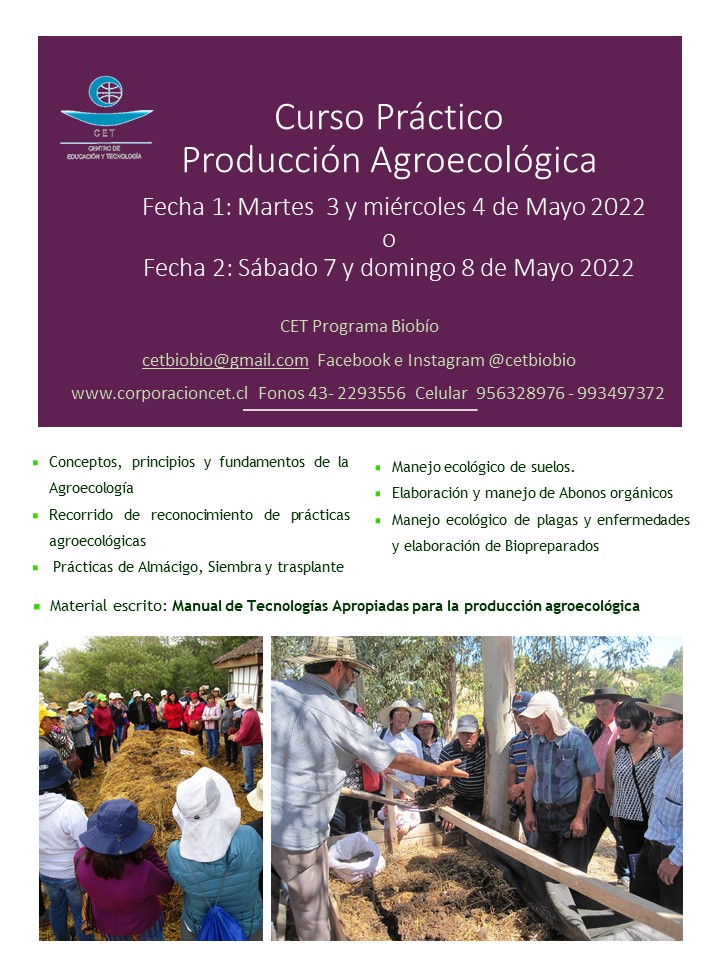 Además se realizará un Curso Práctico de Agroecología en dos Fechas, primero el 3 y 4 de Mayo 2022; y posteriormente el 7 y 8 de Mayo 2022. En palabras del CET Biobío "La metodología para la realización de estos cursos es Aprender Haciendo, la cual se basa en actividades prácticas, reforzadas con un marco teórico. Se hará entrega a cada participante de material escrito correspondiente al Manual de Tecnologías Apropiadas para la producción agroecológica, además de un Certificado acreditando su asistencia al Curso".