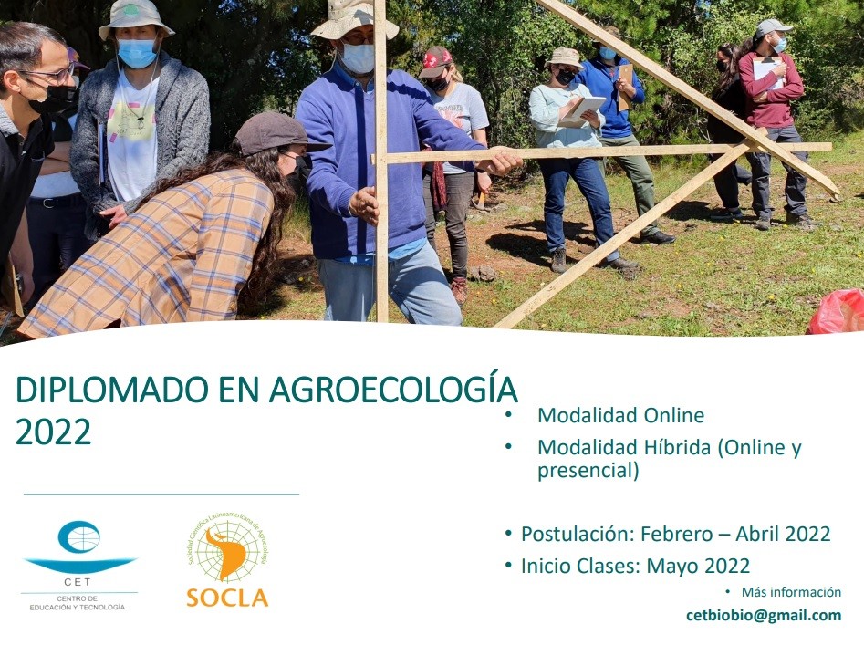 Ya se abrieron las postulaciones para el Diplomado en Agroecología 2022 en su Modalidad Online y además en su modalidad Híbrida (Online y presencial). La postulación comenzó en Febrero y termina en Abril de 2022, siendo el inicio de clases en Mayo de 2022.