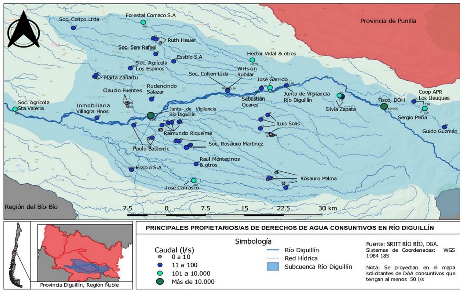 [caption id="attachment_149793" align="aligncenter" width="918"] Imagen: Principales propietarios/as de derechos de aprovechamiento de aguas (DAA) en río Diguillín, comunas de Pinto, El Carmen y San Ignacio (años 1993-2021). Fuente: Elaborado por Tamara Puchi para proyecto FI/UBB n°2070011. Extraído de: 10.24850/j-tyca-16-1-10[/caption]