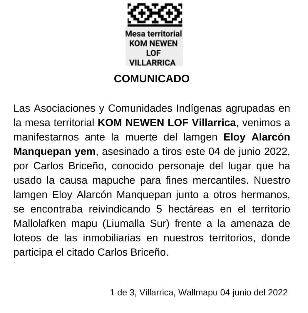 En el comunicado explicaron que "Nuestro lamgen Eloy Alarcón Manquepan junto a otros hermano se encontra reivindicando 5 hectáreas en el territorio Mellolafken mapu (Liumalla Sur) frente a la amenaza de loteos de las inmobiliarias en nuestros territorios, donde participa el citado Carlos Briceño"