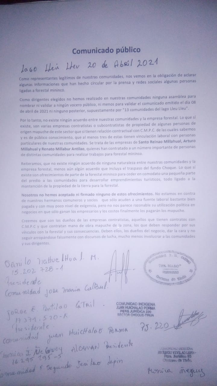 "No existe ningún acuerdo entre nuestras comunidades y la empresa forestal. Lo que sí existe, son varias empresas contratistas o subcontratistas de propiedad de algunas personas de origen mapuche de este sector que sí tienen relación contractual con CMPC, de las cuales sabemos y es de público conocimiento, que al menos tres de éstas tienen vinculación laboral con particulares de nuestras comunidades. Se trata de las empresas de Santo Reinao Millahual, Arturo Millahual y Renato Millahual Antilao, quienes han contratado a un número importante de personas de distintas comunidades para realizar trabajos para Forestal Mininco".